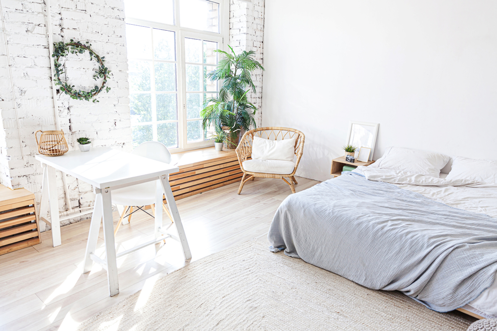 ไอเดียแต่งห้องนอนไม่มีเตียงบรรยากาศสบายๆ น่านอน ต้องยกให้การตกแต่งสไตล์มินิมอล โดยจัดโทนสีห้องสว่างๆ ผนังสีขาว พื้นลายไม้โทนสีอ่อน พร้อมหน้าต่างบานใหญ่รับแสงเข้าห้องให้เต็มที่ เลือกใช้เฟอร์นิเจอร์โทนสีขาว เช่น โต๊ะ เก้าอี้ ชั้นวางของสีขาว วางของตกแต่งให้เป็นระเบียบลงตัว เสริมด้วยกระจกเงาตั้งพื้นสไตล์มินิมอล ใช้เพิ่มความมั่นใจก่อนออกจากบ้านได้เป็นอย่างดี