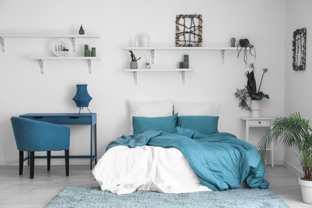 ไอเดียแต่งห้องนอนไม่มีเตียงด้วยสีทูโทน ดูเรียบง่าย แต่ไม่น่าเบื่อ ให้ตกแต่งผนังห้องและเลือกเฟอร์นิเจอร์ในโทนสีขาว ทั้งฟูกที่นอน โต๊ะ และกระถางต้นไม้ ตัดด้วยเฟอร์นิเจอร์หรือของตกแต่งสีฟ้าน้ำทะเล ของหมอน ผ้าห่ม โต๊ะทำงาน ตกแต่งเพิ่มเติมด้วยพรมสีฟ้าอ่อนมาวางไว้ปลายฟูก และเสริมชั้นวางของติดผนังหลากหลายขนาดไว้บนผนังหัวเตียง