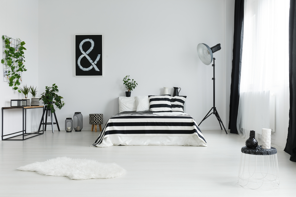 นอกจากสไตล์มินิมอลและสแกนดิเนเวียแล้ว ไอเดียแต่งห้องนอนไม่มีเตียงยังใช้กับการตกแต่งสไตล์โมเดิร์นได้อีกด้วย และเพื่อเพิ่มความแตกต่างไม่เหมือนใคร โคมไฟสตูดิโอตั้งพื้น ถือเป็นของแต่งห้องที่ตอบโจทย์ได้เป็นอย่างดี โดยเลือกวางข้างที่นอนเพื่อให้แสงสว่างเฉพาะจุด ประกอบกับเลือกใช้ผ้าปูที่นอนลายทางสีขาว-ดำ จะช่วยเพิ่มความโดดเด่นให้กับการคุมโทนสีในห้องให้สวยงามลงตัว