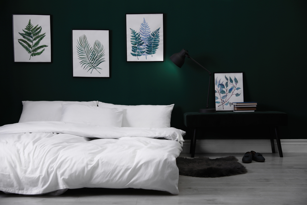 15. แต่งห้องด้วยรูปภาพต้นไม้ เสริมผนังสีเขียวเข้มให้น่าค้นหา