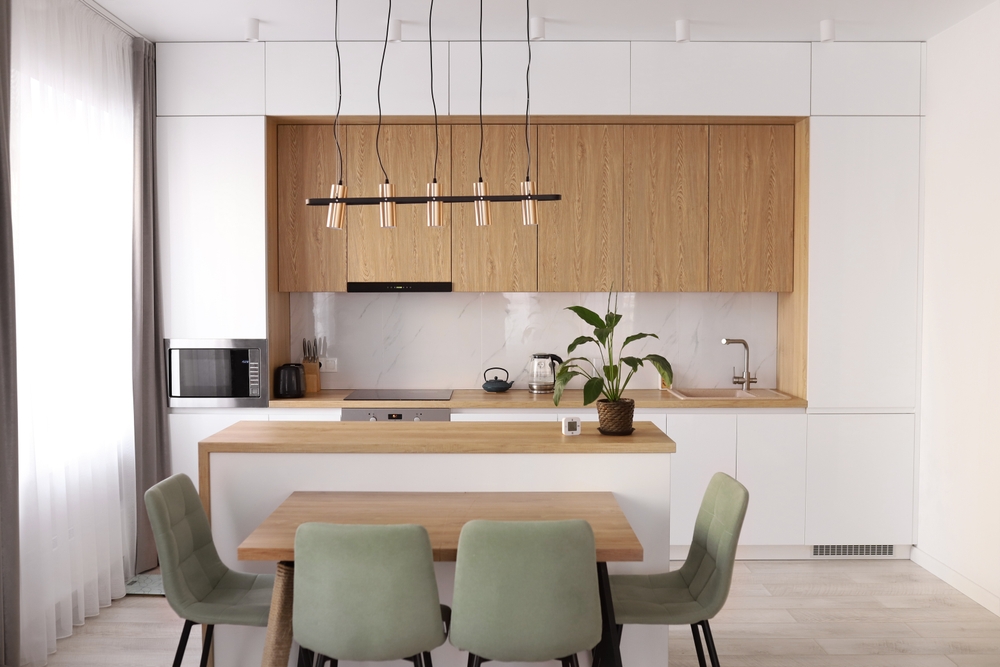 สายบิลต์อินที่อยากรีโนเวตห้องครัวให้เป็นสไตล์มินิมอล ให้ติดตั้งเคาน์เตอร์ครัวสีขาวท็อปไม้ คู่กับตู้เก็บของลายไม้ด้านบน เน้นดีไซน์แบบไร้ที่จับ และมีช่องฝังไมโครเวฟให้ดูกลมกลืนไปกับชุดครัวโดยรวม ติดตั้งไอส์แลนด์ครัวเพื่อเพิ่มพื้นที่และแบ่งโซนทำอาหารได้อย่างชัดเจน พร้อมเพิ่มกิมมิกเล็กๆ ด้วยเก้าอี้ทานข้าวสีเขียวเอิร์ธโทน และโคมไฟเพดานดีไซน์เก๋