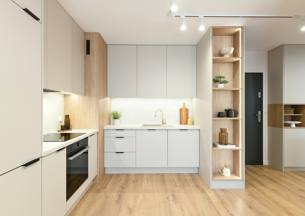 จุดเด่นของห้องครัวมินิมอล คือการเน้นใช้ดีไซน์ที่เรียบง่าย ใช้โทนสีขาว สีเบจ และสีน้ำตาล จับคู่กับสีโทนเข้มเพื่อเพิ่มกิมมิกให้โดดเด่น รวมถึงการใช้ตู้เก็บของแบบมัลติฟังก์ชันที่มีทั้งลิ้นชัก ชั้นวาง และมีพื้นที่เตรียมอาหารไว้ในชิ้นเดียวกัน เพื่อประหยัดพื้นที่และทำให้ห้องครัวดูกว้างขึ้น