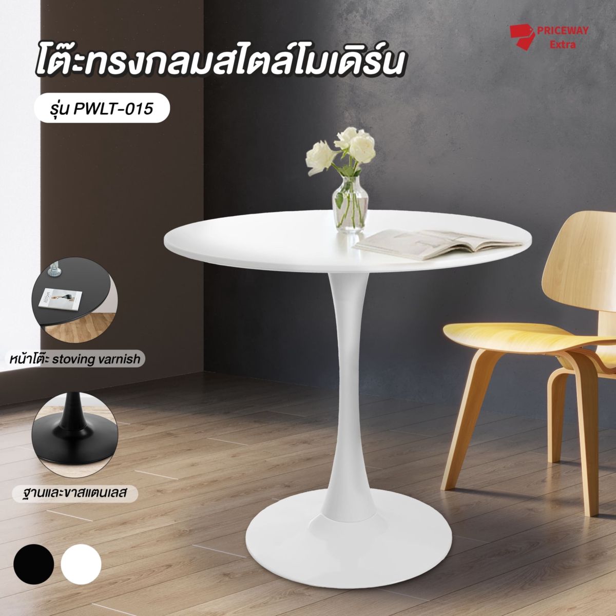 โต๊ะรับประทานอาหาร รุ่น PWLT-015 จาก PRICEWAY ดีไซน์ทรงกลมสุดมินิมอล หน้าโต๊ะเคลือบ Varnish ช่วยป้องกันรอยขีดข่วนและคราบสกปรก ตัวฐานและโครงขาทำจากสแตนเลสเคลือบอย่างดี มีความแข็งแรงสูง รับน้ำหนักได้มากถึง 100 กก. มาพร้อม 2 สีให้เลือกตามสไตล์ที่ชอบ ทั้งสีขาวและสีดำ นำไปเข้าชุดกับห้องครัวสไตล์มินิมอลบอกเลยว่าปัง