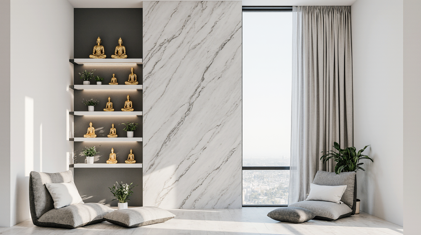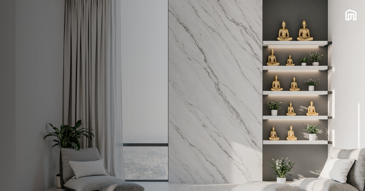 ตกแต่งห้องพระด้วยกระเบื้องพื้นและผนังในโทนสีอ่อน เช่น สีขาว สีเทาอ่อน เลือกลวดลายที่ไม่ฉูดฉาด เพื่อเพิ่มมิติให้ห้องพระดูหรูหรา งดงาม มีระดับ ได้บรรยากาศที่สงบนิ่ง เรียบง่าย และความบริสุทธิ์อันเป็นหัวใจของพื้นที่ศรัทธานี้