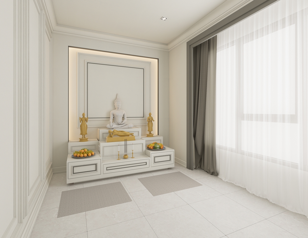 เลือกใช้หิ้งพระหรือตู้พระโทนสีขาวมินิมอล ควบคู่กับการลดทอนของตกแต่งที่มากเกินความจำเป็น จะช่วยเสริมให้องค์พระดูโดดเด่น สวยงาม ให้บรรยากาศภายในห้องดูโปร่ง สว่าง สอดรับกับคอนเซ็ปต์การจัดห้องพระยุคใหม่ที่ให้ความสำคัญกับความเรียบง่าย ความสงบ และความศรัทธา