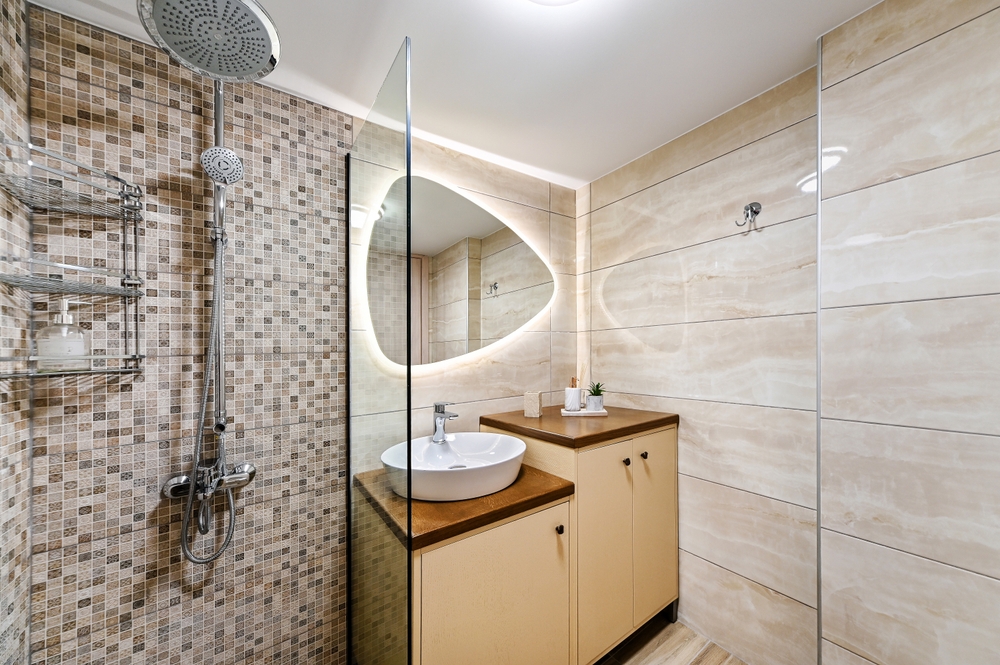 แต่งห้องน้ำโรงแรมให้มีสไตล์ ให้เลือกใช้กระจกดีไซน์โมเดิร์นเก๋ๆ พร้อมไฟซ่อนผนัง ส่วนผนังโซนอาบน้ำกรุด้วยกระเบื้องโมเสคลายเล็ก ช่วยเพิ่มเท็กซ์เจอร์ให้ดูมีมิติ ส่วนผนังอีกด้านใช้กระเบื้องลายไม้โทนอ่อน จับคู่กับอ่างล้างหน้าทรงกลมวางบนเคาน์เตอร์ไม้