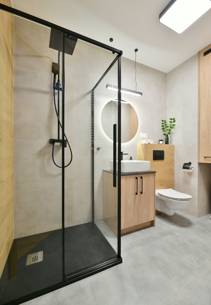 10. คุมโทนห้องน้ำสีเทาอ่อน ตัดด้วยองค์ประกอบสีดำ และผิวไม้ธรรมชาติ