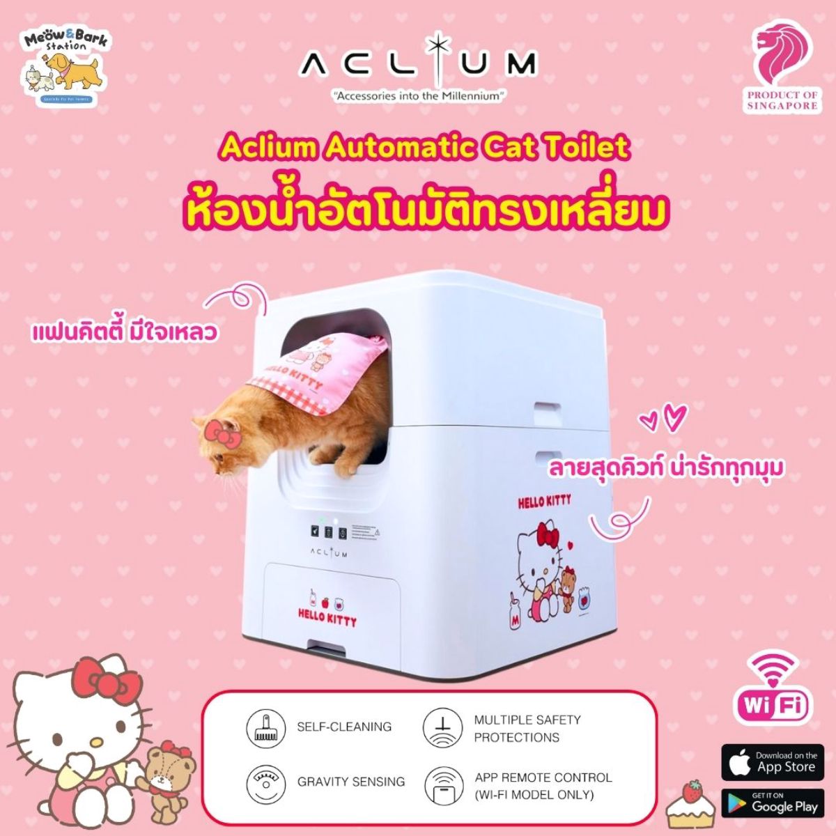 ลวดลายน่ารักเกินต้าน เจ้านายเห็นแล้วต้องใจฟู ห้องน้ำแมวอัตโนมัติยี่ห้อ Aclium รุ่น Hello Kitty ดีไซน์ทรงเหลี่ยม ฟังก์ชันครบ ตอบโจทย์ไลฟ์สไตล์ ด้วยการควบคุมผ่านแอปพลิเคชัน สะดวกสบาย รู้ข้อมูลต่างๆ แบบเรียลไทม์ ถังเก็บของเสียจุได้ 10 ลิตร นานถึง 14 วัน ไม่ต้องคอยเก็บบ่อย มาพร้อมระบบเก็บกลิ่นและตลับน้ำหอม จัดการกลิ่นรบกวนได้อยู่หมัด มีเซนเซอร์ตรวจจับทั้งภายในและภายนอก เพื่อความปลอดภัยของเจ้าเหมียว รองรับน้ำหนักได้มากถึง 12 กิโลกรัม เจ้านายจะไซซ์ใหญ่แค่ไหนก็ใช้ได้สบายๆ