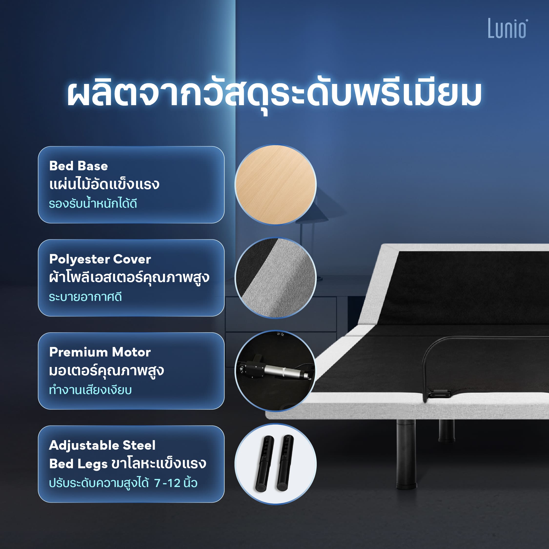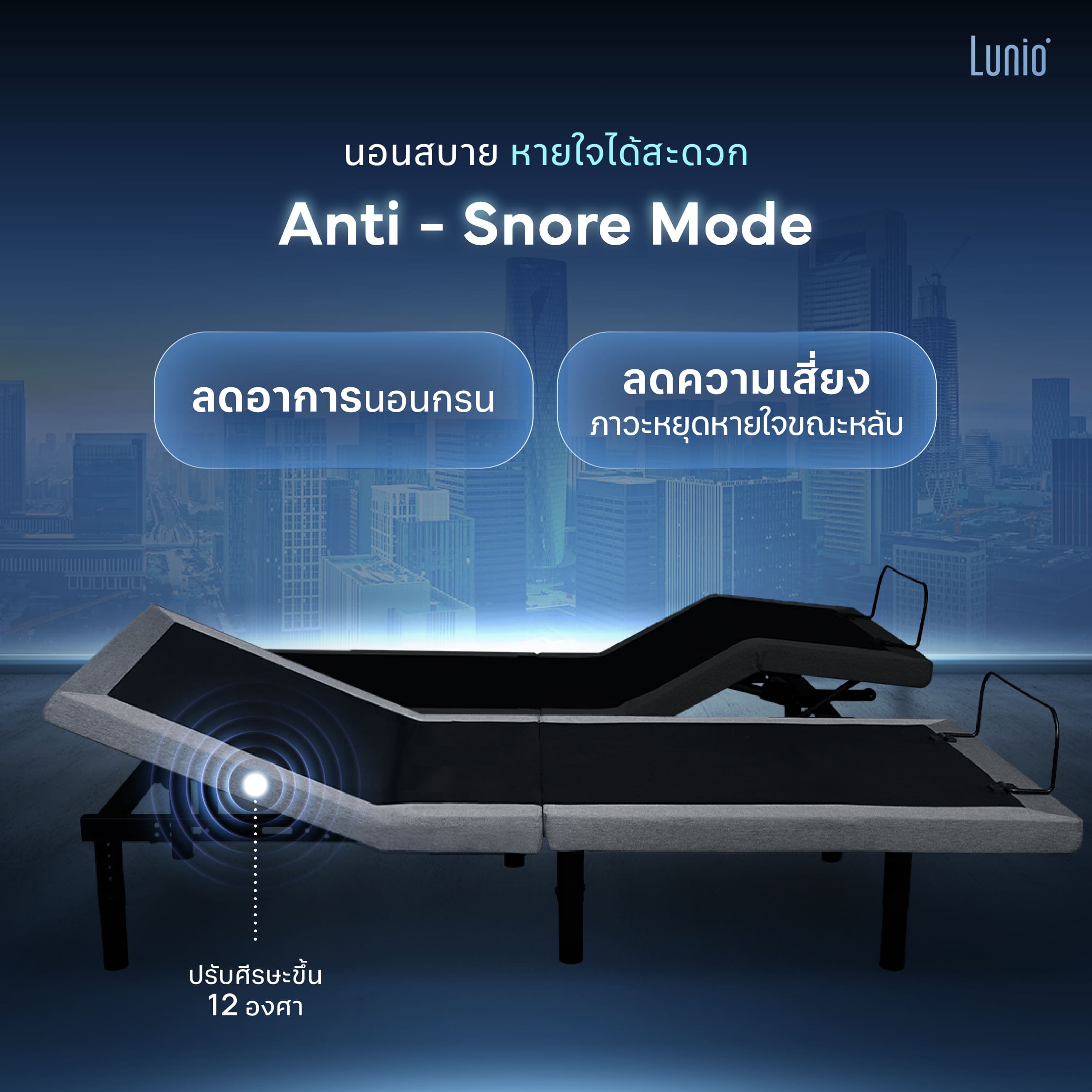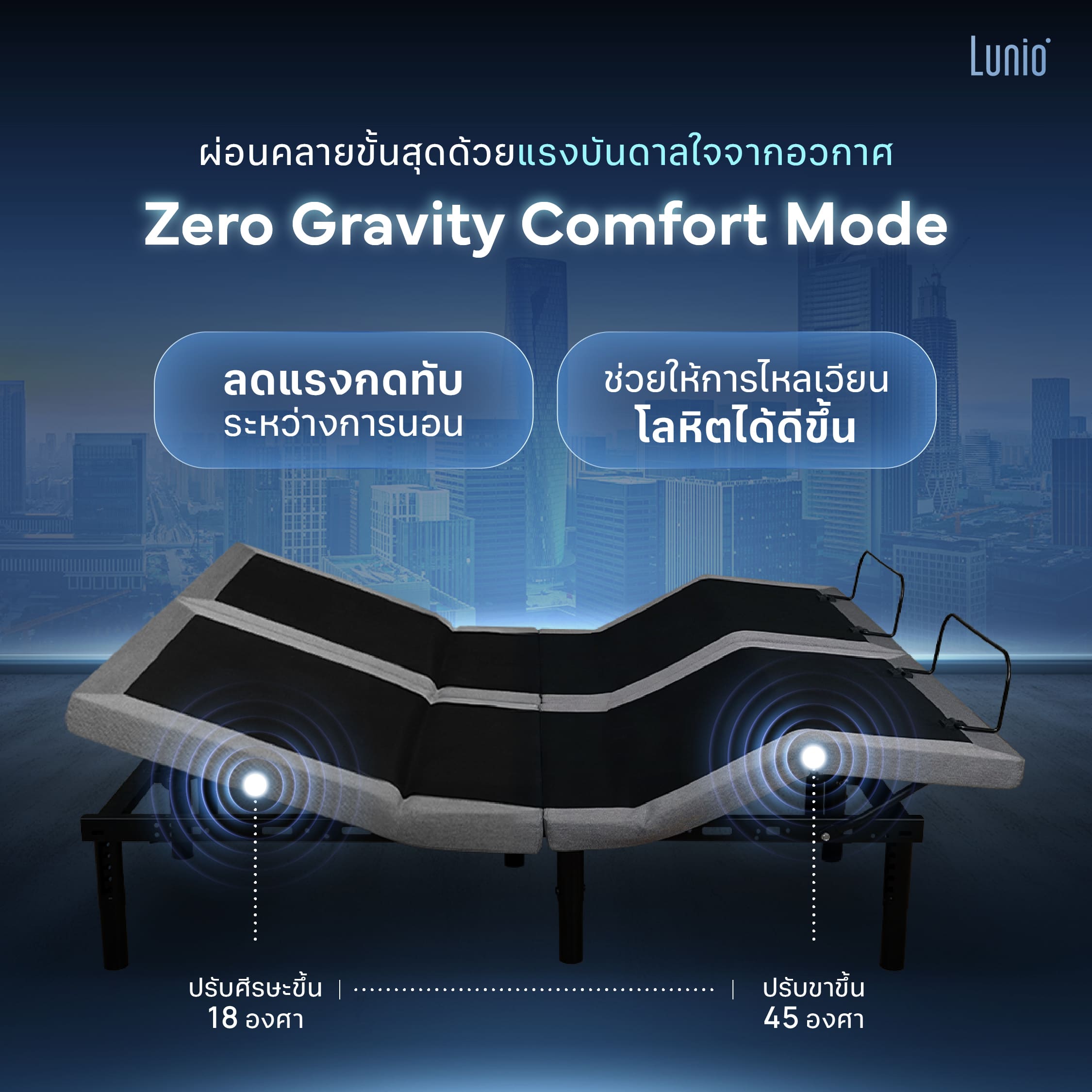 - Lunio Smart Sleep Set คู่หูแห่งการพักผ่อนที่สมบูรณ์ มาพร้อมเตียงปรับระดับไฟฟ้า Lunio Smart Rise ที่ใช้งานง่าย รองรับระบบ Split King ปรับองศาแยกซ้าย-ขวา และฟังก์ชันดูแลสุขภาพถึง 5 โหมด ผสานกับที่นอน Lunio Gen 4 ที่ผลิตจากวัสดุพรีเมียมถึง 7 ชั้น ช่วยเพิ่มคุณภาพการนอนให้ดียิ่งขึ้น โดยที่ทุกคนสามารถ personalize ความสบายในแบบฉบับของตัวเองได้