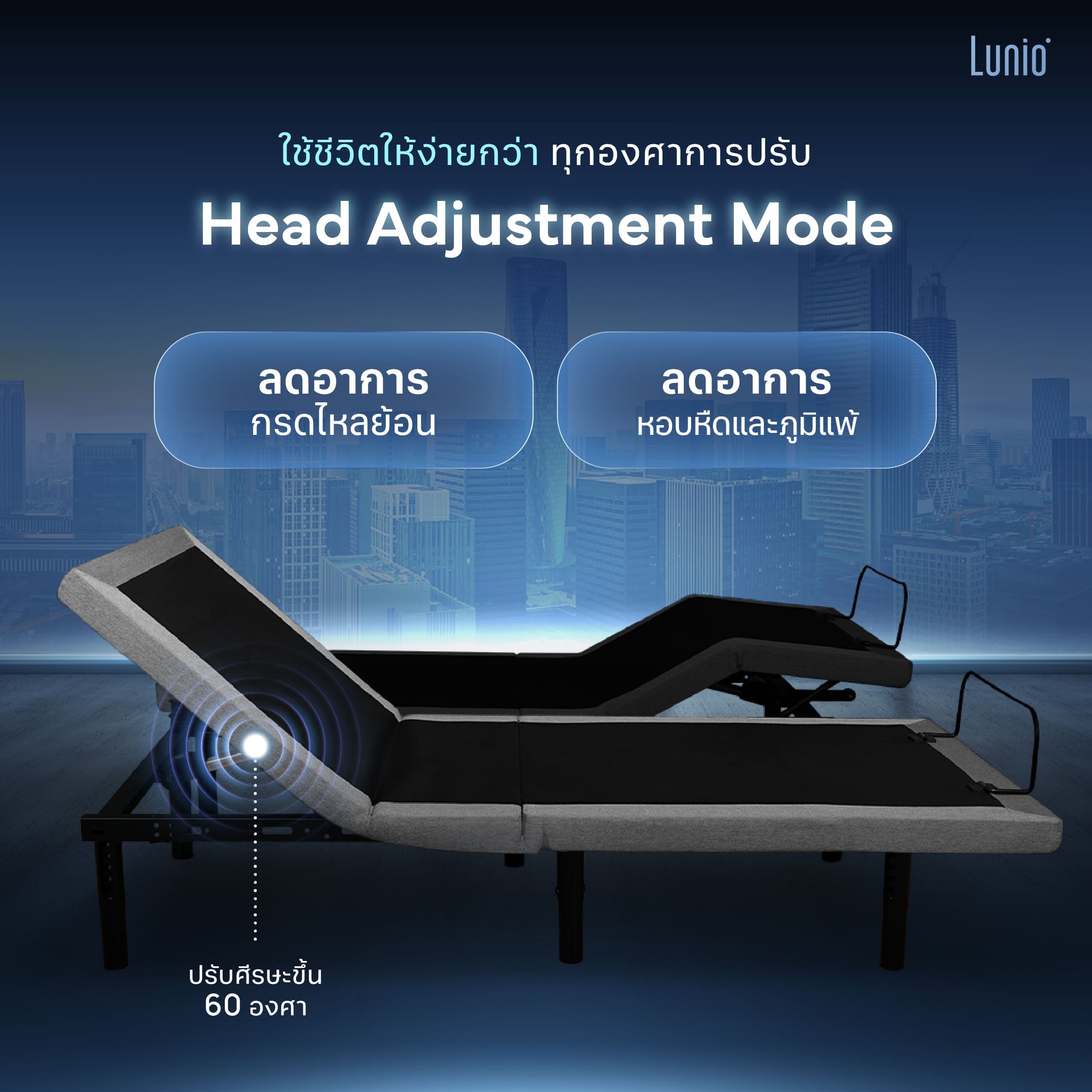 สามารถปรับระดับศีรษะได้สูงสุดถึง 60 องศา เหมาะกับการนั่งดูทีวี อ่านหนังสือ หรือนั่งทำงานบนเตียง ทั้งยังช่วยลดอาการกรดไหลย้อน หอบหืด และปัญหาการหายใจติดขัด ตอบโจทย์ทั้งด้านความสบาย และแก้ไขปัญหาสุขภาพได้แบบพร้อมๆ กัน