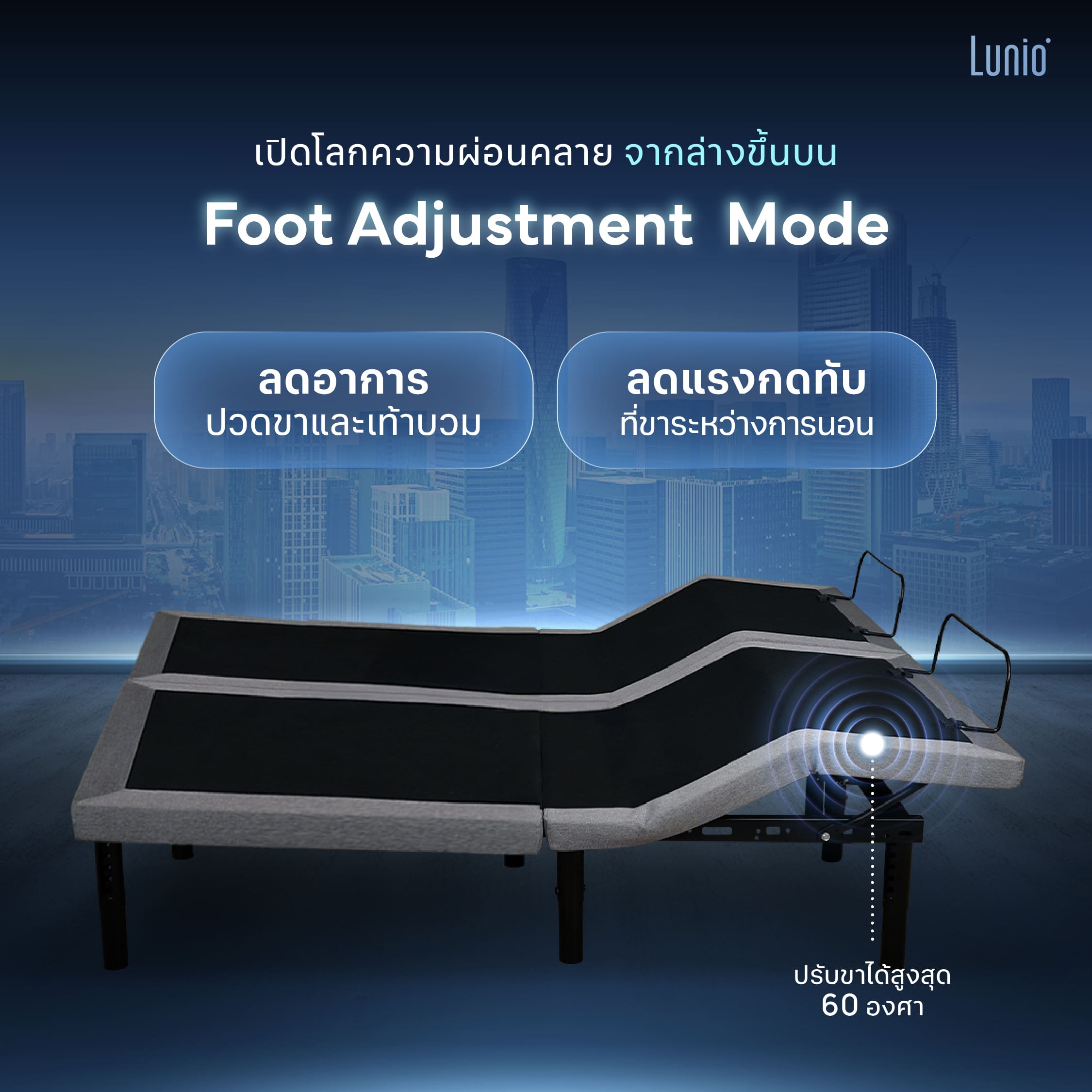 ผ่อนคลายได้อีกขั้น ด้วยโหมดการปรับระดับส่วนล่างของเตียงได้มากถึง 60 องศา ช่วยลดอาการปวดขา หรือเท้าบวม เพิ่มการไหลเวียนของเลือด ลดความเมื่อยล้าจากการนั่งหรือยืนเป็นเวลานานๆ ทำให้นอนหลับได้สบาย ตื่นมาสดชื่นกระปรี้กระเปร่า
