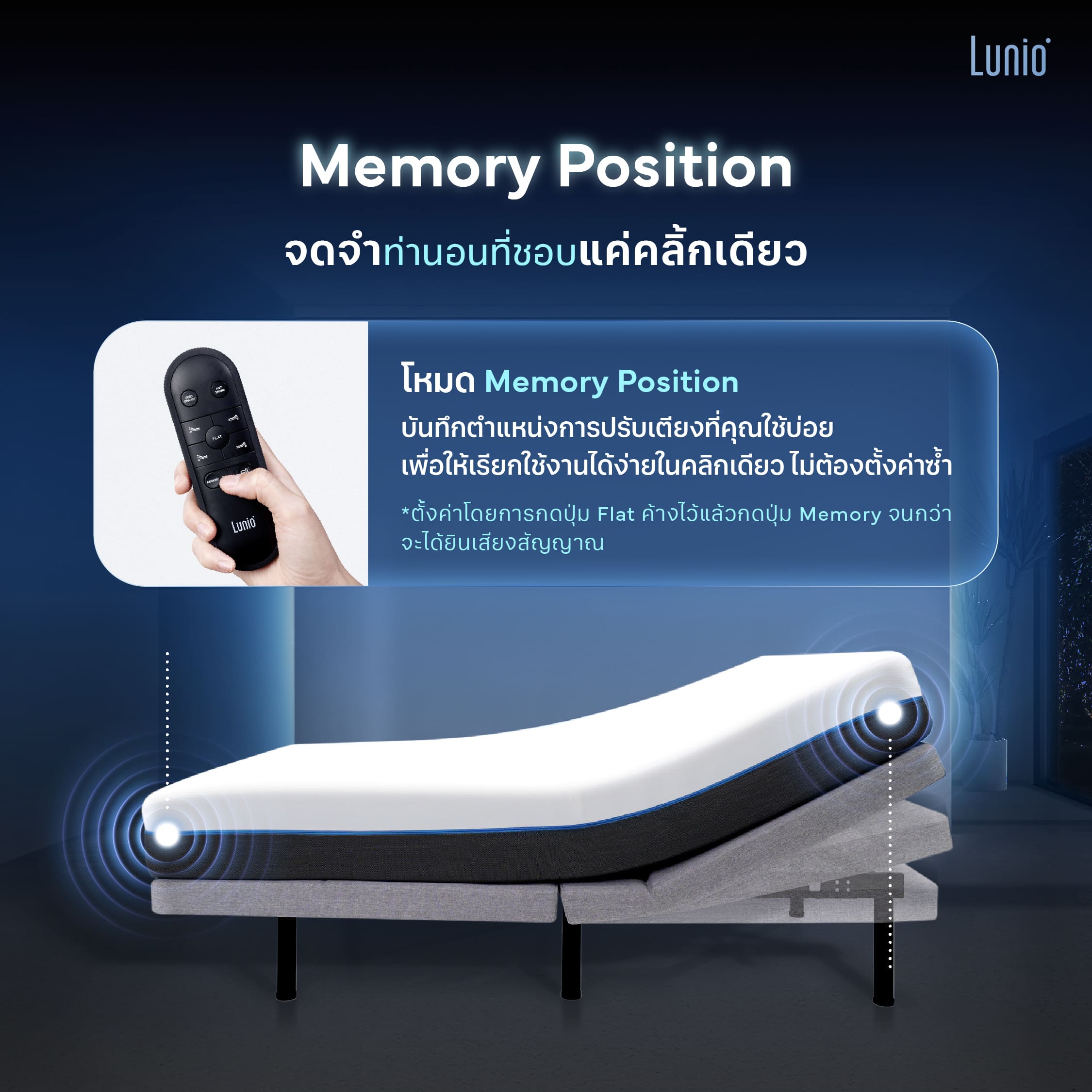จดจำตำแหน่งการปรับเตียงที่ใช้งานบ่อยๆ โดยไม่ต้องคอยตั้งค่าใหม่ทุกครั้ง การใช้งานก็แสนง่าย เพียงคลิกเดียวผ่านรีโมตคอนโทรล ตอบโจทย์ความสะดวกสบาย สามารถพักผ่อนได้อย่างรวดเร็ว ไม่เสียเวลา