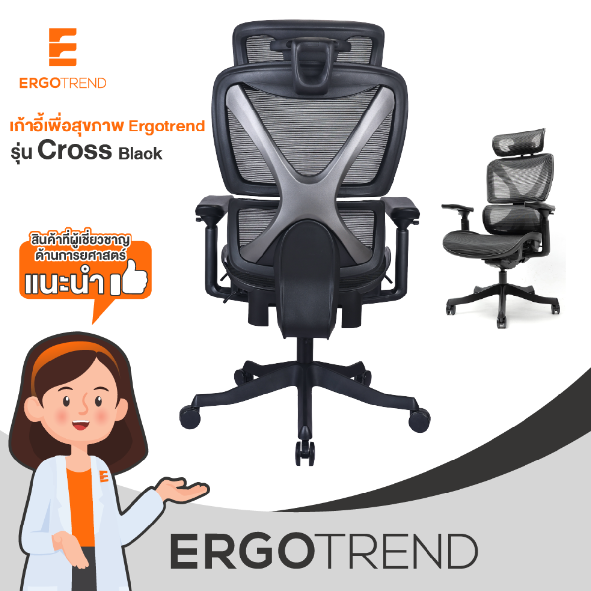 ลุกก็ไม่โอย นั่งก็ไม่โอย เพราะใช้เก้าอี้เพื่อสุขภาพ Ergotrend รุ่น Cross Black ที่รองรับสรีระร่างกายให้นั่งได้อย่างเป๊ะปัง ด้วยโครงสร้างพนักพิงหลังแบบคู่ ดูแล 4 จุดสำคัญของร่างกาย ทั้งไหล่, หลัง, เอว และสะโพก ผสานกับ Lumbar Support และที่พักแขน 3D ปรับได้ทุกทิศทางแบบ 180 องศา จะเอนหลังผ่อนคลาย หรือโน้มตัวจดจ่อกับหน้าจอคอม ก็นั่งได้สบาย ไม่ฝืนร่างกายจนปวดเมื่อย