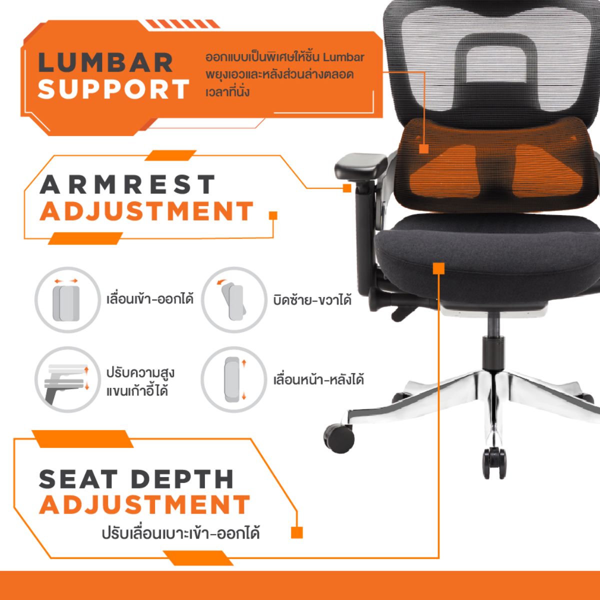 - พนักพิงหลังส่วนล่างปรับระดับขึ้น-ลงได้ ช่วยรองรับส่วนเว้าของเอวได้อย่างเหมาะสม
