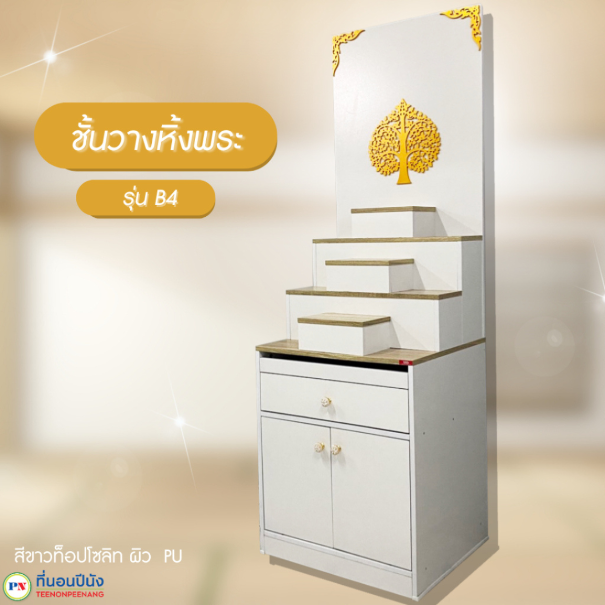 เสริมสิริมงคลให้บ้าน ด้วยโต๊ะหมู่บูชา รุ่น B4 จากที่นอนปีนัง ดีไซน์สีขาว ผลิตจากวัสดุ Top Solid เคลือบด้วยผิว PU ทนทานต่อรอยขีดข่วน เช็ดถูได้ง่าย โดดเด่นด้วยลายต้นโพธิ์สีทองบริเวณฉากหลัง มาพร้อมฐานวางพระที่มีการไล่ระดับอย่างชัดเจน จัดวางพระพุทธรูปได้หลากหลายขนาด อีกทั้งบริเวณด้านล่างมีตู้เก็บของ พร้อมลิ้นชักถาดยาว ผลิตจากไม้เมลามีนคุณภาพสูง ผิวเรียบเนียน กันน้ำ ทนทาน ใช้งานได้ยาวนาน