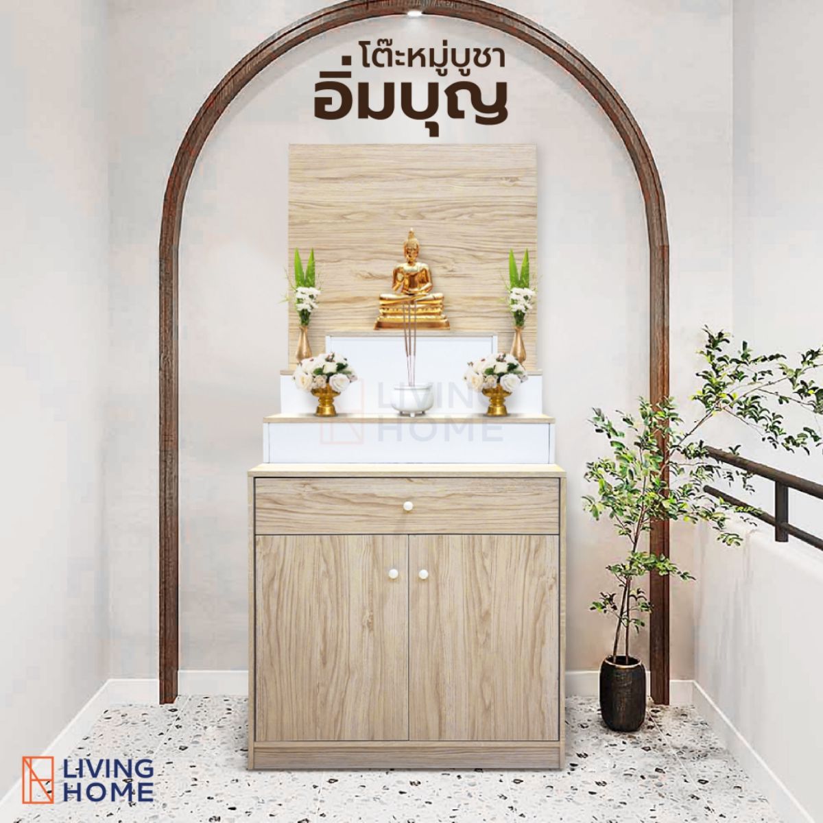 โต๊ะหมู่บูชาโมเดิร์น รุ่นอิ่มบุญ จาก Livinghome Furniture ผลิตจากไม้ปาร์ติเกิลบอร์ดผิวเรียบเนียน น้ำหนักเบา เคลื่อนย้ายสะดวก มาในโทนสีไม้ธรรมชาติ พร้อมลิ้นชักและตู้เก็บของขนาดใหญ่ ช่วยจัดเก็บสิ่งของบูชาให้เป็นระเบียบ เหมาะสำหรับการสร้างสมาธิและเป็นมุมสงบเล็กๆ ที่ช่วยเติมพลังใจ