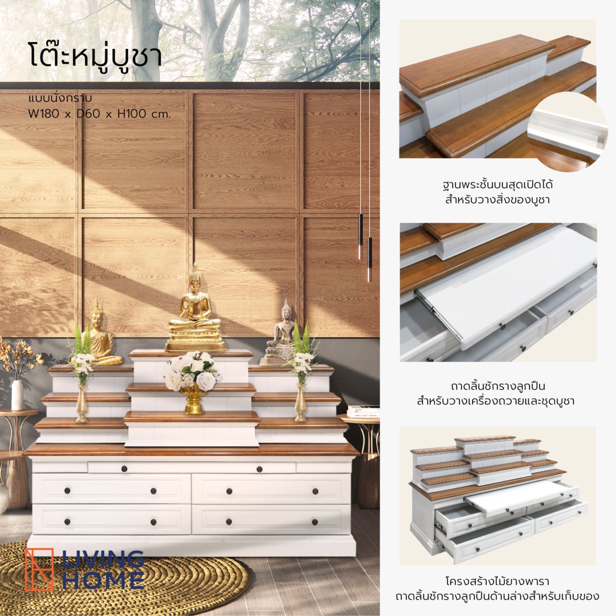 7. โต๊ะหมู่บูชา รุ่น NANGKRAP จาก Livinghome Furniture ขนาด 150 ซม. และ 180 ซม. ฐานวางพระขนาดใหญ่ พร้อมพื้นที่จัดเก็บแบบจัดเต็ม