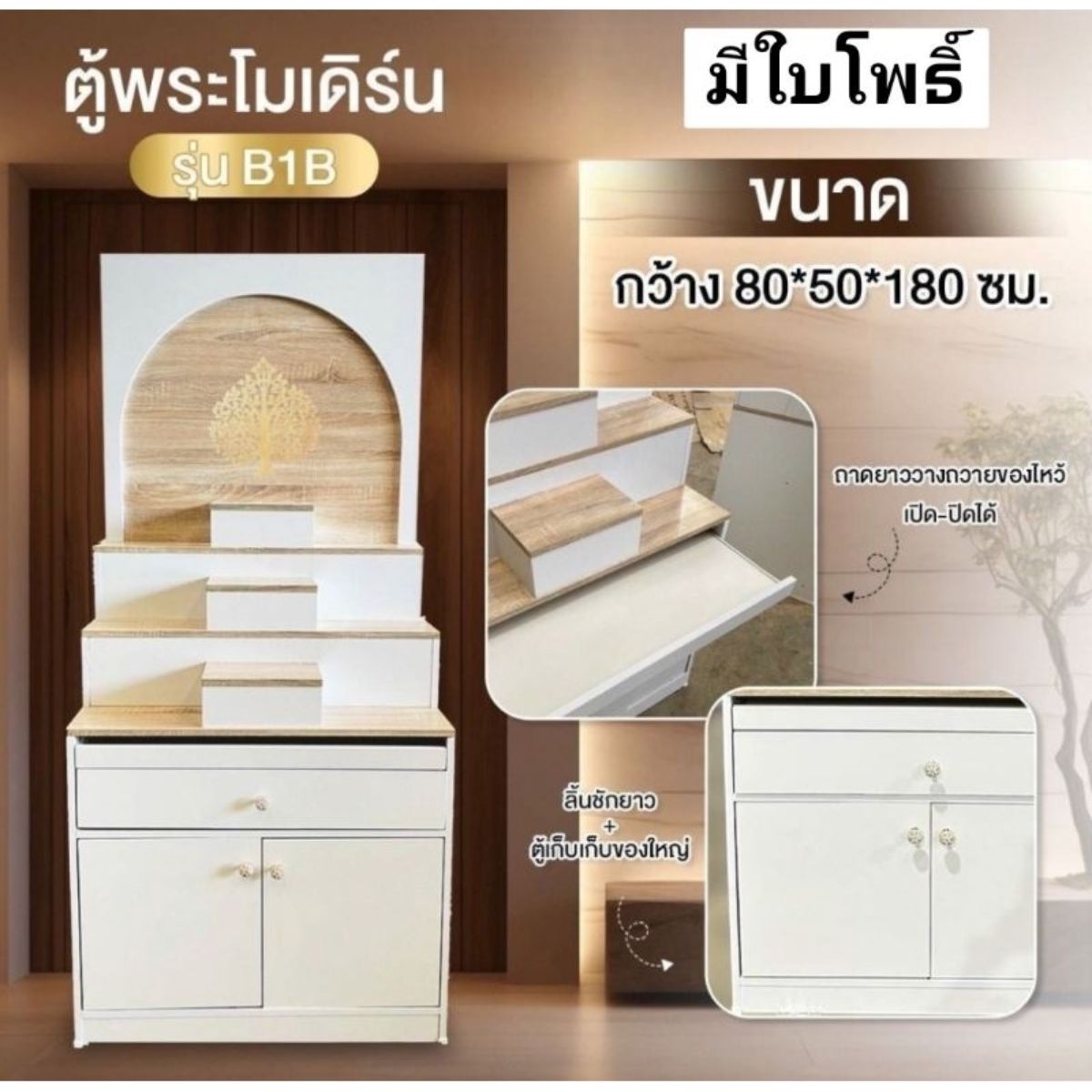 โต๊ะหมู่บูชา รุ่น B1B จาก พี.พี.เฟอร์นิเจอร์ ผลิตจากไม้ปาร์ติเกิลบอร์ด ปิดผิวด้วย PU คุณภาพสูง ทนทานต่อรอยขีดข่วน ตัวโต๊ะมาในโทนสีขาวผสานลายไม้ธรรมชาติ และฉากหลังตกแต่งด้วยทรงโค้งมน เพิ่มมิติให้ทันสมัยยิ่งขึ้น พร้อมประดับรูปต้นโพธิ์สีทองอร่าม สื่อถึงความเป็นสิริมงคล ให้ทุกคนในบ้านมีความสุข ความเจริญรุ่งเรือง