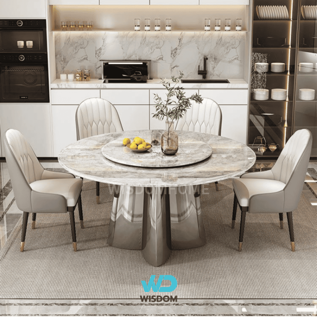 วางตรงไหนก็สวยหรูลงตัว ด้วยโต๊ะอาหาร Dining Table สำหรับ 4 ที่นั่ง รุ่น WD107 จาก Wisdom Home ที่มาพร้อมดีไซน์สุดหรูหราจากลวดลายหินอ่อน เสริมด้วยโครงขาสแตนเลสสีเงิน เหมาะกับการตกแต่งสไตล์ลักซ์ชัวรีที่สะท้อนรสนิยม อีกทั้งยังมีฟังก์ชันในการหมุนบนโต๊ะ เพื่อง่ายและสะดวกต่อการกินอาหารอีกด้วย