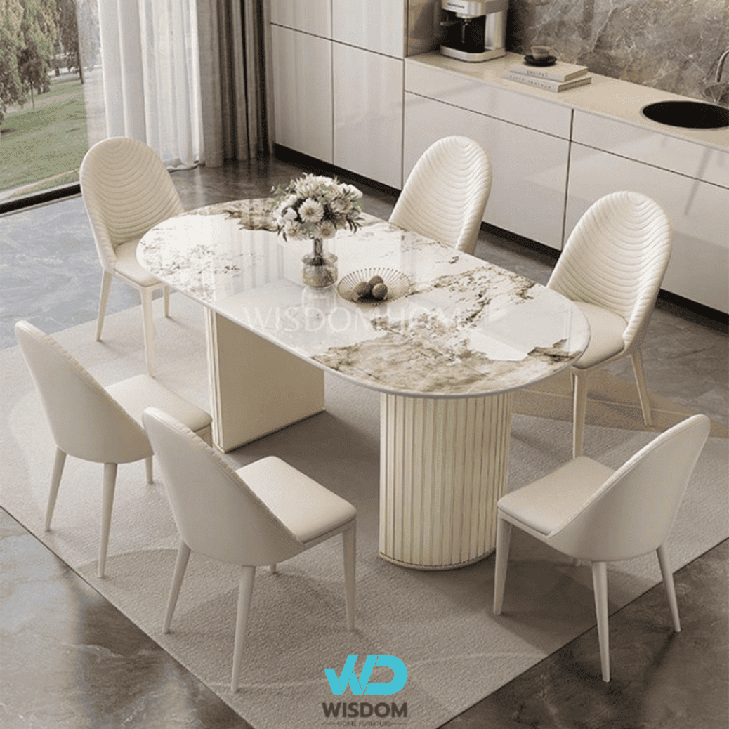 สร้างบรรยากาศมุมรับประทานอาหารให้สวยสะดุดตาสำหรับห้องขนาดใหญ่ ด้วยโต๊ะอาหารหินอ่อนทรงโค้งรี รุ่น Onda จาก Wisdom Home ขนาดกว้าง 90 x ยาว 180 เซนติเมตร โครงขาลอนคลื่นตัดเส้นขอบทอง เสริมภาพลักษณ์ให้ห้องมีความโมเดิร์น เรียบหรู เหมาะสำหรับการตกแต่งบ้านสไตล์ลักซ์ชัวรี ขอบโต๊ะออกแบบให้โค้งมน ลดโอกาสเกิดอุบัติเหตุจากแรงกระแทกได้ดี ไม่ว่าจะลุกหรือนั่งก็สบายใจได้เลย