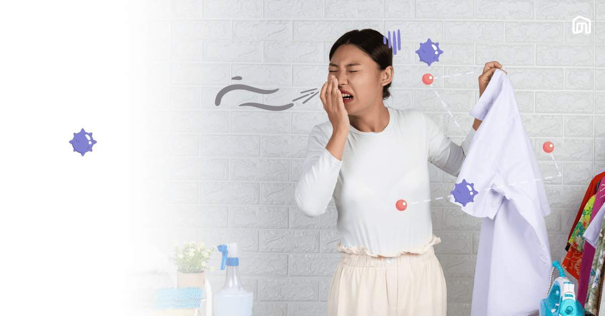 - เสื้อผ้าเหม็นอับ เกิดจากการที่เสื้อผ้าได้รับแสงแดดไม่เพียงพอ จนเกิดเป็นความชื้นสะสม รวมถึงการเลือกใช้น้ำยาซักผ้าที่ไม่ได้มาตรฐาน ผงซักฟอกตกค้าง การแช่เสื้อผ้าข้ามคืน และการไม่ทำความสะอาดเครื่องซักผ้าเป็นเวลานาน