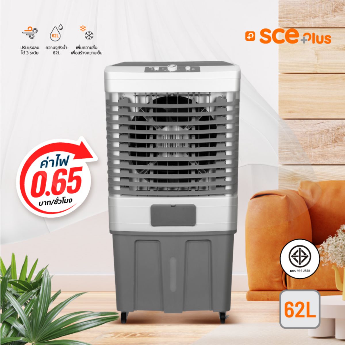 พัดลมไอเย็นยี่ห้อไหนดี ? ที่เหมาะสำหรับชาวคอนโดหรือพื้นที่จำกัด ต้องพัดลมไอเย็น รุ่น Max S ความจุ 10 ลิตร จาก SCE Plus เย็นสบายในพื้นที่ 8–12 ตร.ม. สบายใจได้เรื่องค่าไฟ เพราะใช้ไฟแค่ 65 วัตต์ เปิดทั้งวันก็จ่ายแค่ประมาณ 0.21 บาทต่อชั่วโมง มาพร้อมช่องลมขนาดใหญ่ ปรับแรงลมได้ 3 ระดับตามต้องการ แถมยังมีล้อเลื่อนที่สะดวกต่อการเคลื่อนย้าย พร้อมมาตรฐาน มอก.934-2558 มั่นใจได้เลยใช้งานได้อย่างปลอดภัย