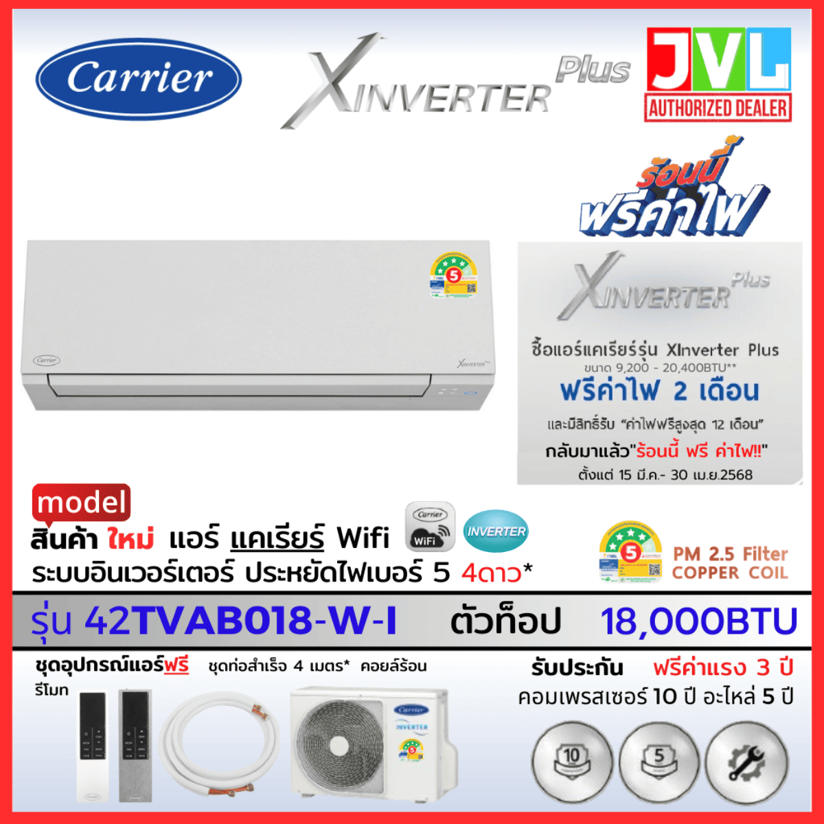 ร้อนนี้ ไม่ต้องกังวลกับบิลค่าไฟ แค่ใช้แอร์ Carrier รุ่น X Inverter Plus (42TVAB-I) มาตรฐานประหยัดไฟเบอร์ 5 สูงสุด 5 ดาว มีขนาด BTU ตั้งแต่ 9,200 ไปจนถึง 30,000 BTU ดีไซน์ทรงเหลี่ยม เรียบหรู ทันสมัย ควบคุมการใช้งานได้ง่าย ๆ ผ่านแอปพลิเคชัน Carrier In The Air เรียกดูค่าไฟได้แบบเรียลไทม์ มาพร้อมนวัตกรรม Gentle Touch ที่ปล่อยลมเย็นจากที่สูง ไม่ระคายผิวหนัง และเทคโนโลยี X-Ionizer ช่วยดักจับแบคทีเรียในอากาศ และฝุ่น PM2.5 ให้อากาศบริสุทธิ์ ปลอดภัยจากมลพิษ
