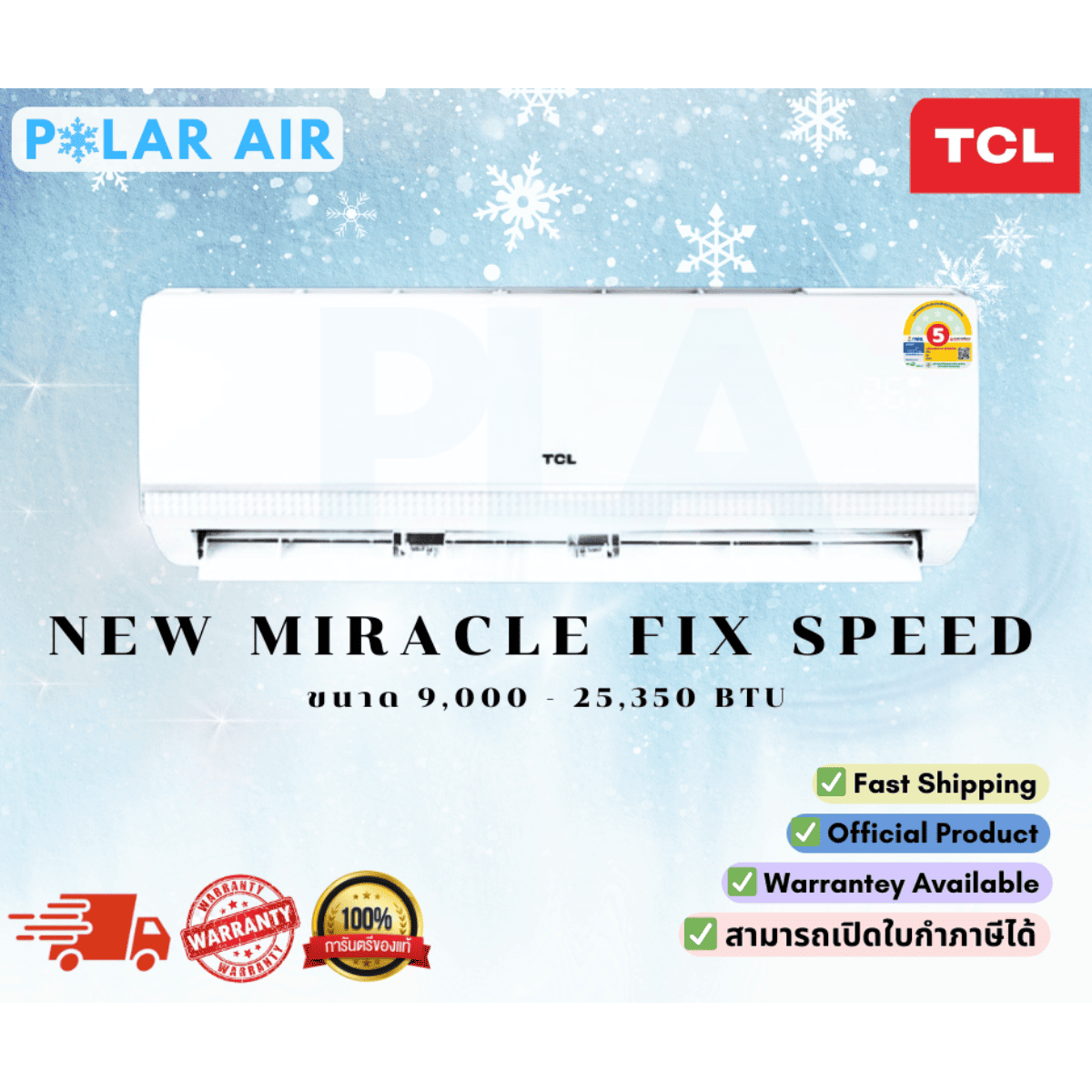 แอร์ TCL รุ่น New Miracle Fix Speed R32 มีขนาด BTU 9,000 -25,350 มาพร้อมเทคโนโลยี Smart 3D Air Flow กระจายลมอัตโนมัติแบบ 4 ทิศทาง ขึ้น-ลง และ ซ้าย-ขวา ให้ความเย็นฉ่ำสบายแบบรอบด้าน อยู่มุมใดของห้องก็รับลมเย็นได้เต็มที่ แม้ในวันที่อากาศภายนอกร้อนจัดก็ไม่ใช่ปัญหา เพราะแอร์รุ่นนี้สามารถทำความเย็นได้เต็มประสิทธิภาพ ด้วยระบบ 60°C Cooling ที่ช่วยระบายความร้อนได้ 100% พร้อมเพิ่มความมั่นใจในเรื่องสุขภาพ ด้วยฟังก์ชัน Filter Clean Reminder ที่จะคอยแจ้งเตือนเมื่อถึงเวลาทำความสะอาดแผ่นกรอง เย็นสบายได้แบบไม่ต้องกังวลเรื่องแบคทีเรีย