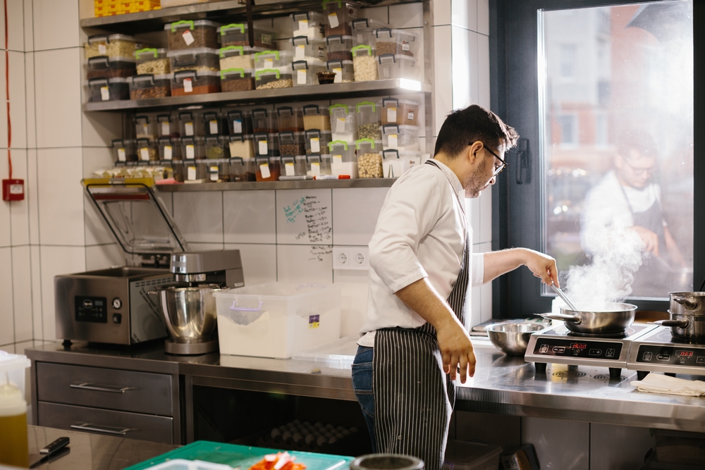 ภาพ: พ่อครัวกำลังทำอาหารในห้องครัวที่มีพื้นที่จำกัด