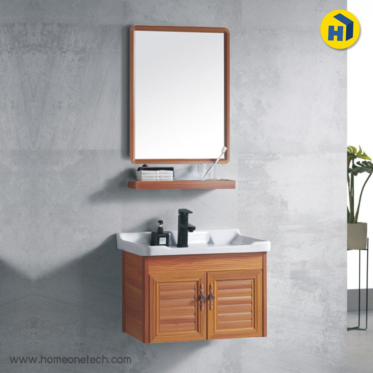 ชุดเคาน์เตอร์อ่างล้างหน้า พร้อมกระจกเงา จาก homeonetech ขนาดกะทัดรัด ลายไม้ธรรมชาติสวยงาม