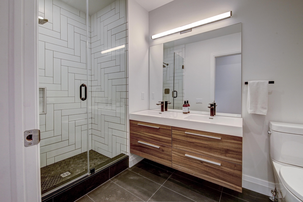 สายโมเดิร์นที่ชอบการออกแบบที่เน้นเส้นสายที่ชัดเจน ให้รีโนเวทห้องน้ำด้วยการใช้สีขาวคุมโทนทั้งห้อง และใช้สีดำแซมเข้าไปในส่วนขององค์ประกอบต่างๆ เช่น ก๊อกน้ำ โครงกระจก และฝักบัวอาบน้ำ แมตซ์กับโทนสีไม้ธรรมชาติจากตู้ใต้อ่างล้างหน้า ผสานกับการใช้กระจกบานใหญ่เต็มพื้นที่ของผนังโซนอ่างล้างหน้า ให้ห้องน้ำมีบรรยากาศที่เปิดโล่ง โปร่งสบาย