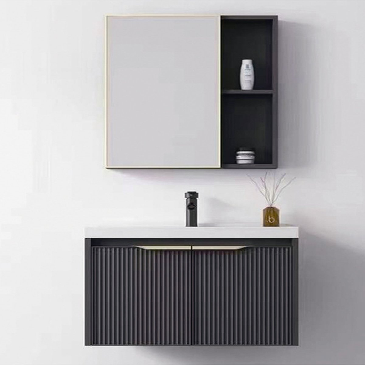 ชุดอ่างล้างหน้าพร้อมเคาน์เตอร์ จาก homeonetech ขนาดกะทัดรัดเพียง 80 x 47 x 40 ซม. มาพร้อมอ่างล้างหน้าเซรามิก ติดตั้งมากับก๊อกน้ำสแตนเลส 304 สไตล์โมเดิร์น ทันสมัย ทนทาน ไม่เป็นสนิม ด้านล่างเป็นเคาน์เตอร์อะลูมิเนียม ปิดด้วยฟิล์มลายคุณภาพสูง ดีไซน์สีเทาเข้ม พื้นผิวเป็นร่องๆ ช่วยเพิ่มมิติให้น่าสนใจ เสริมด้วยกระจกบานใหญ่ มีช่องเก็บของเพิ่มความเป็นระเบียบให้ห้องน้ำ