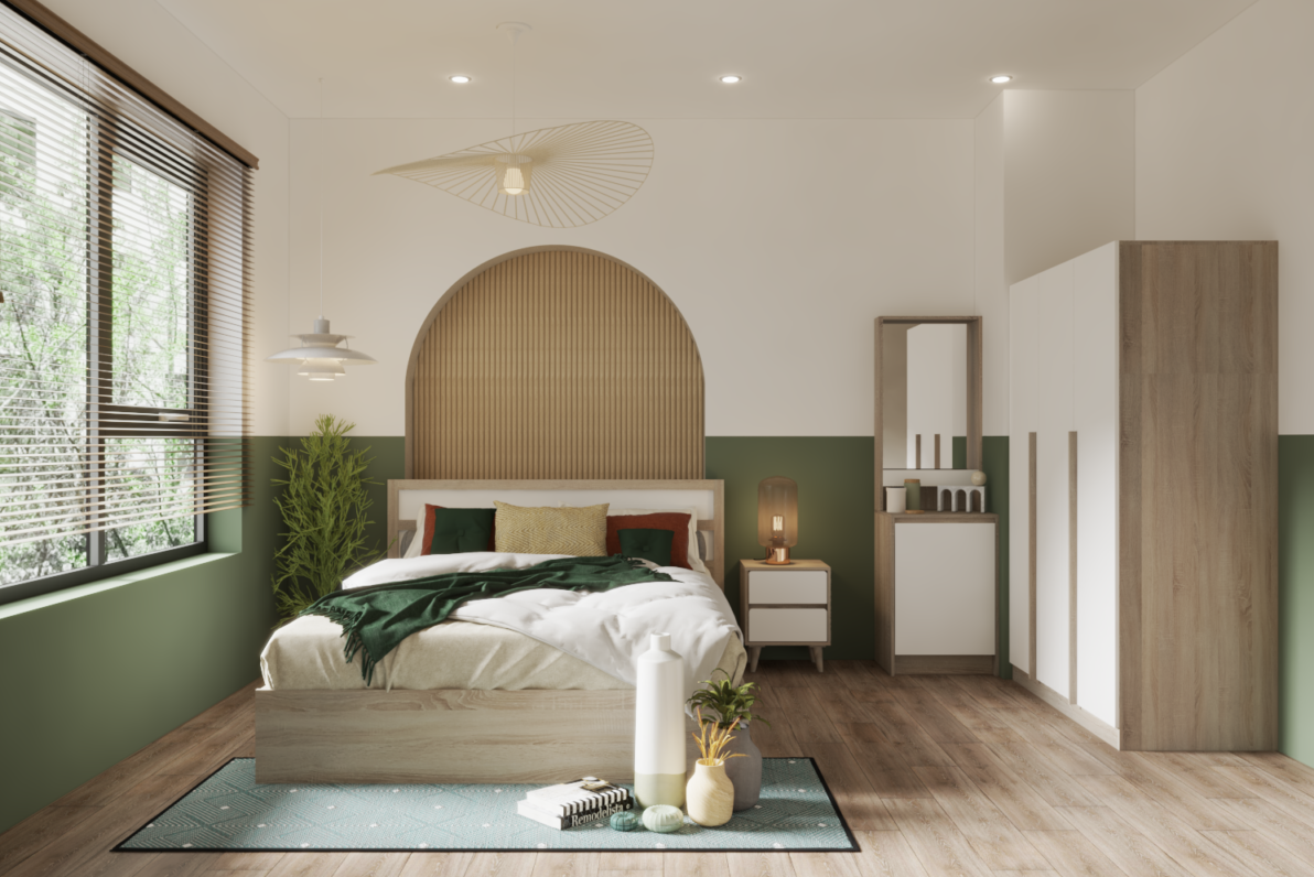 ไอเดียแต่งห้องนอนมินิมอลให้ดูสนุกและมีสีสัน ต้องเลือกชุดห้องนอนเซตสุดคุ้ม รุ่น MALFOY จาก Looms ในเซตมีทั้งเตียงนอนขนาด 5 ฟุต ตู้เสื้อผ้า 3 บานเปิด โต๊ะเครื่องแป้งแบบยืนพร้อมตู้เก็บของด้านล่าง และตู้ข้างเตียงขนาดกะทัดรัด มาพร้อมดีไซน์สีโซลิดโอ๊คตัดสีขาวทุกชิ้น นำไปแมตซ์กับผนังห้องสีเขียว-ขาวแบบทูโทน ตกแต่งผนังหัวเตียงด้วยไม้ลายฉลุทรงโค้ง ปูพื้นลายไม้ วางพรมเก๋ๆ ได้ห้องนอนมินิมอลที่ให้ความสบายใจทุกครั้งที่กลับมาพักผ่อน
