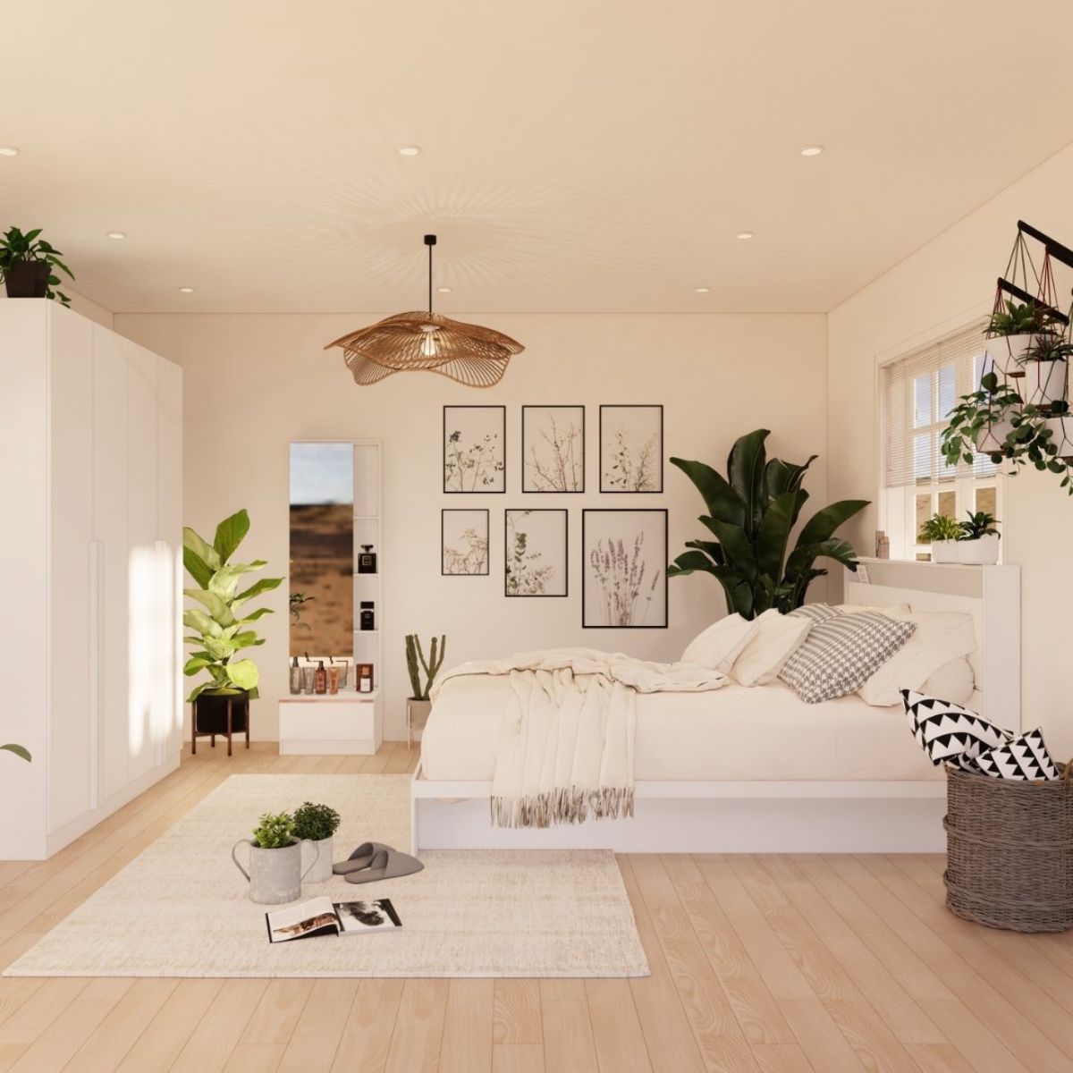 3. ปูพื้นสีไม้อ่อนในห้องสีขาว วางต้นไม้ตามมุมห้อง พร้อมเลือกใช้ชุดห้องนอน จาก Looms