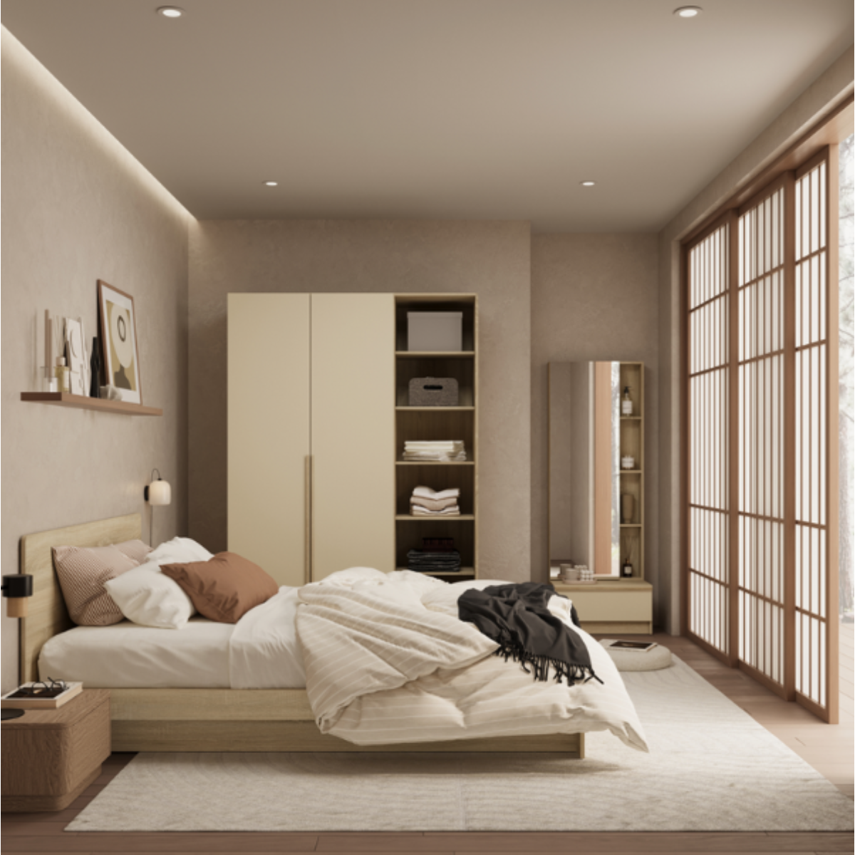 แต่งห้องนอนสไตล์มินิมอลในมู้ดแสนอบอุ่น ต้องชุดห้องนอน รุ่น KC-GO จาก KONCEPT FURNITURE ที่จัดเซตมาให้ในโทนสีไม้อ่อนสุดละมุน มีทั้งเตียงนอน 6 ฟุต ตู้เสื้อผ้าที่มีช่องด้านข้างเปิดโล่ง และโต๊ะเครื่องแป้งบานกระจกสูง นำไปจับคู่กับผนังห้องโทนสีเบจ พร้อมปูพรมขนาดใหญ่เต็มพื้นที่ บวกกับเลือกใช้บานประตู้ไม้แบบโปร่งแสงสไตล์ญี่ปุ่น