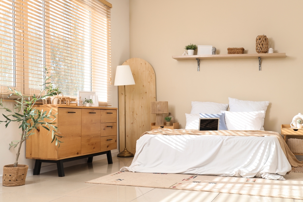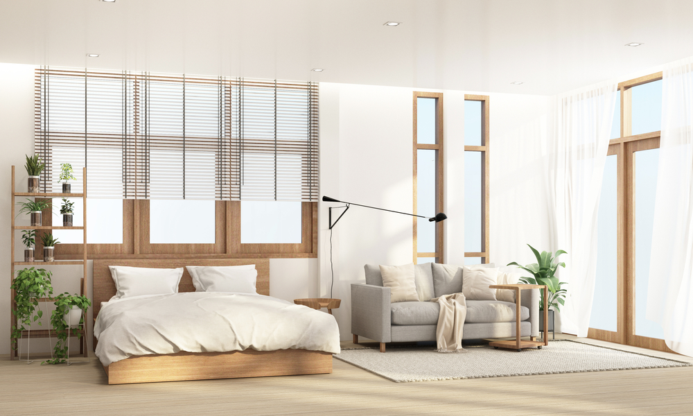 ห้องนอนมินิมอลแบบญี่ปุ่น จะใช้ดีไซน์ที่เรียบง่าย โดยสีที่เห็นได้บ่อยๆ จะเป็นแนวเอิร์ธโทน ทั้งสีขาว สีเบจ สีน้ำตาลอ่อน และสีเทาอ่อน ใช้วัสดุจากธรรมชาติเป็นหลัก เช่น เฟอร์นิเจอร์ผิวไม้ เสื่อทาทามิ รวมถึงพื้นลายไม้ พร้อมติดตั้งบานกระจกใหญ่เปิดรับแสง ให้บรรยากาศในห้องดูสว่าง โปร่งสบาย
