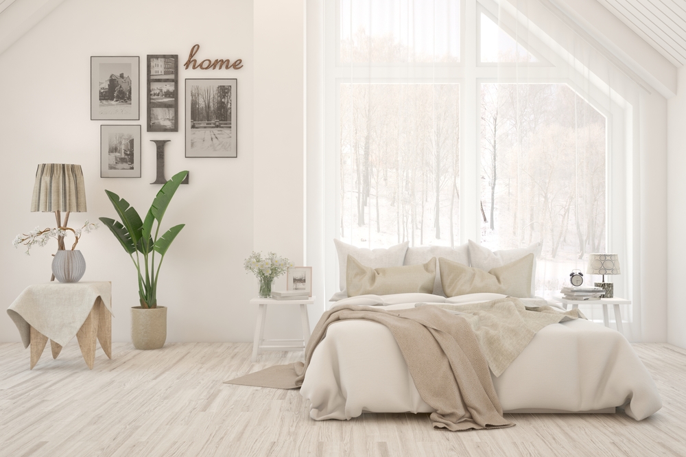 คุมโทนห้องนอนมินิมอลด้วยโทนสีขาว ในส่วนผนังห้อง ผ้าคลุมเตียง และโต๊ะข้างเตียง ตัดด้วยกรอบรูปอาร์ตๆ โทนสีขาว-ดำตามผนัง พร้อมปลอกหมอนและผ้าห่มโทนสีเบจ บวกกับโคมไฟตั้งโต๊ะแบบโมเดิร์น และจัดวางต้นไม้เพิ่มพื้นที่สีเขียวให้ห้องมีสีสัน ปิดท้ายด้วยการปูพื้นโทนสีเทาอมเบจอ่อนๆ เพิ่มบรรยากาศผ่อนคลายในห้องนอน