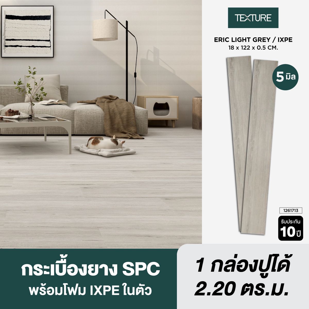 กระเบื้องยาง SPC ลายไม้ รุ่น ERIC LIGHT GREY จาก TEXTURE ลวดลายไม้ชัดเจน ติดตั้งง่ายด้วยระบบ Click Lock สามารถปูทับพื้นเดิมได้เลยโดยไม่ต้องรื้อให้ยุ่งยาก โดยรุ่นนี้มาในความหนาถึง 5 มม. แถมยังมีโฟม IXPE ในตัว ช่วยเก็บเสียงรบกวนเวลาเดิน และให้สัมผัสนุ่มละมุนเท้า