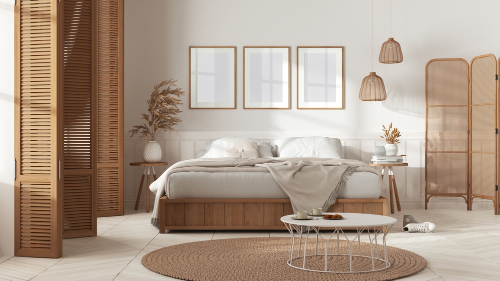 ตกแต่งห้องพักโรงแรมในสไตล์ Natural Minimal ที่เน้นวัสดุไม้จากธรรมชาติเป็นหลัก เสริมด้วยแสงแดดอบอุ่นๆ ที่สร้างบรรยากาศความผ่อนคลายเหมือนอยู่บ้านพักตากอากาศ ใช้เตียงไม้พร้อมผ้าปูสีครีมนุ่มฟู มีพร็อพอย่างแจกันดอกไม้แห้ง โคมไฟหวาย และกรอบรูป ช่วยเพิ่มความ Cozy แถมด้วยฉากกั้นและไม้ระแนงที่ช่วยเพิ่มกลิ่นอายความสโลว์ไลฟ์สุดๆ แขกที่ชอบความเงียบสงบต้องหลงรักห้องพักสไตล์นี้