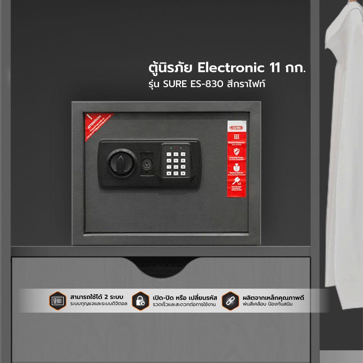 ตู้เซฟนิรภัยอิเล็กทรอนิกส์ รุ่น ES-830 จาก SURE ดีไซน์สีกราไฟท์สุดคูล ขนาดกะทัดรัด จะเจาะยึดผนังกำแพงหรือวางตั้งพื้นได้ตามสะดวก พร้อมระบบล็อกอัตโนมัติที่จะทำงานทันทีเมื่อกดรหัสผิด 3 ครั้ง หมดกังวลเรื่องความปลอดภัย พร้อมกุญแจฉุกเฉิน 2 ดอก ในกรณีที่ลืมรหัสผ่านหรือแบตเตอรี่หมด ตัวตู้ผลิตจากเหล็กกล้าคุณภาพดี ทนทานสูง ใช้งานได้ยาวนาน