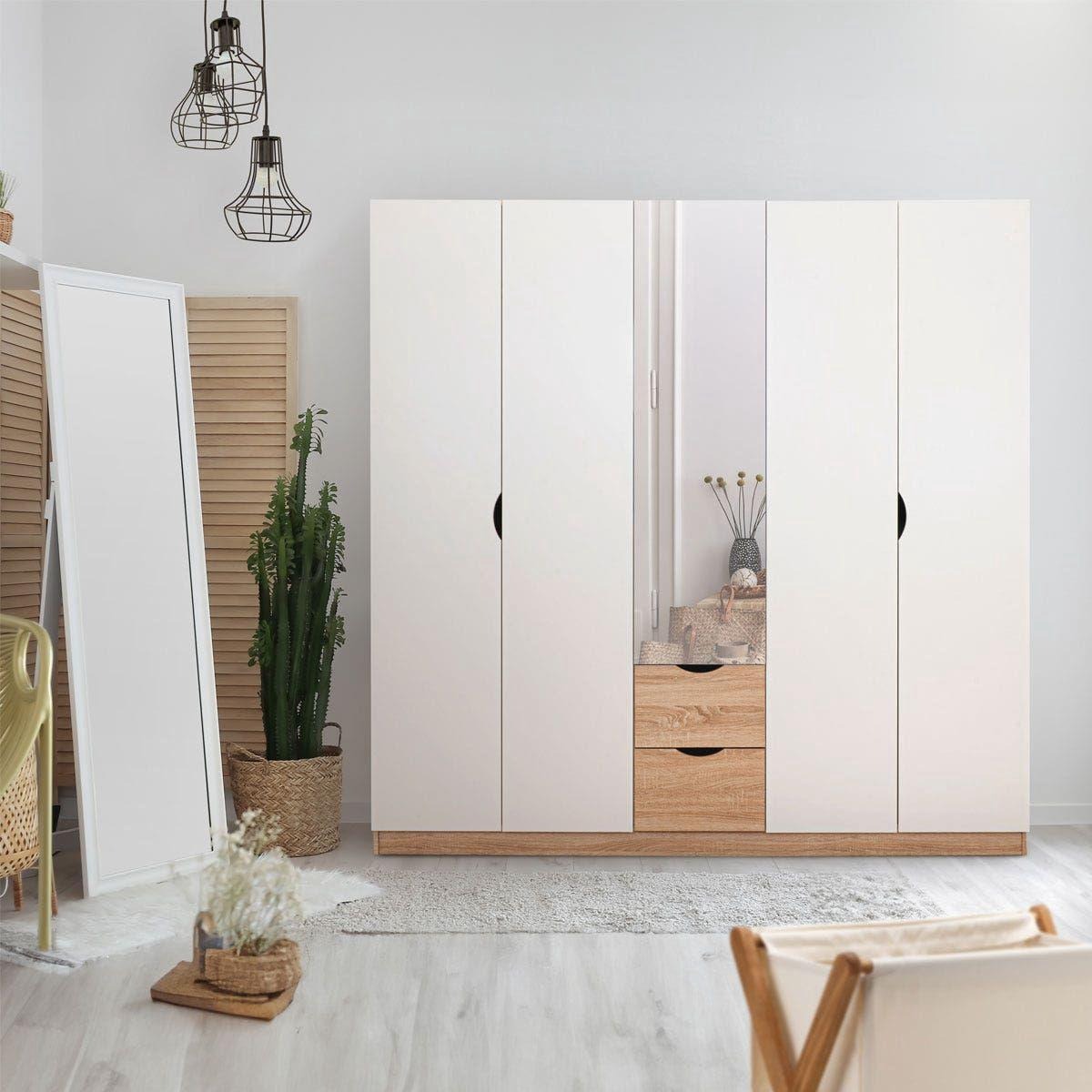 ตู้เสื้อผ้า รุ่น Havin ขนาด 200 ซม. มาในดีไซน์สีโซลิดโอ๊คตัดสีขาวผสานกับหน้าบานกระจกเงา ช่วยให้ห้องดูสว่างและกว้างขวางยิ่งขึ้น มาพร้อมหน้าบานเปิด 5 หน้าบาน ภายในมีชั้นแขวนเสื้อผ้าได้ทั้งชั้นบน-ล่าง พร้อมลิ้นชัก 2 ชั้น มีพื้นที่สำหรับแยกประเภทเสื้อผ้าได้อย่างเป็นสัดส่วน คุ้มค่าในงบหลักพัน